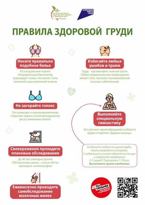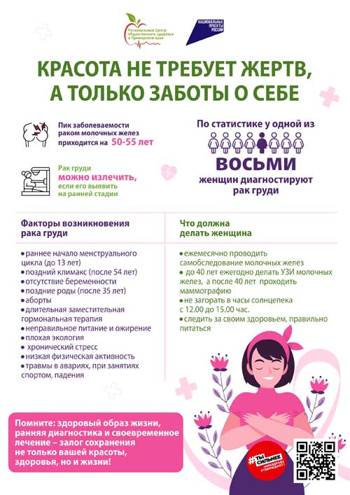 • Не пренебрегайте маммографией! Женщины от 40 до 75 лет должны проходить исследование не реже 1 раза в 2 года;
