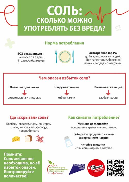 Поэтому важно читать этикетки: если в 100 г продукта больше 0,5 г соли (или 120 мг натрия) это уже значимый вклад.